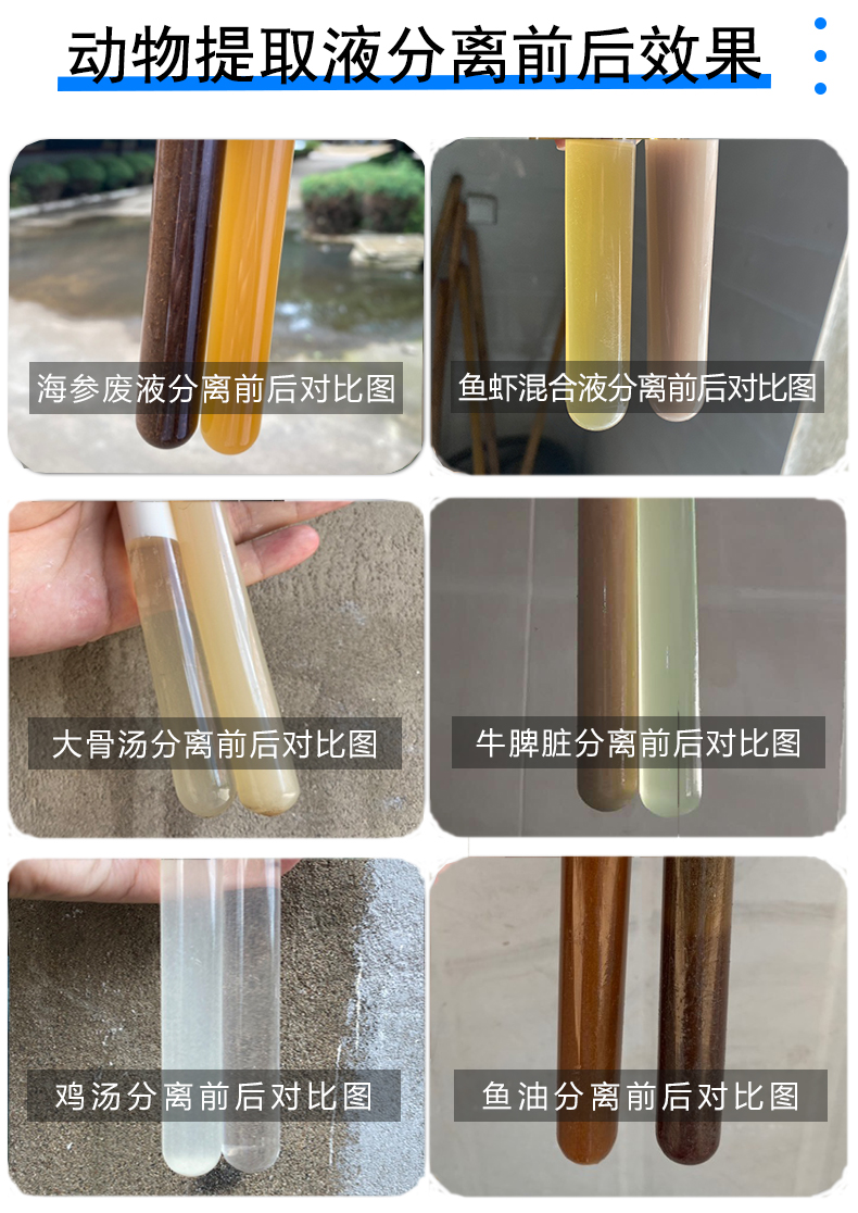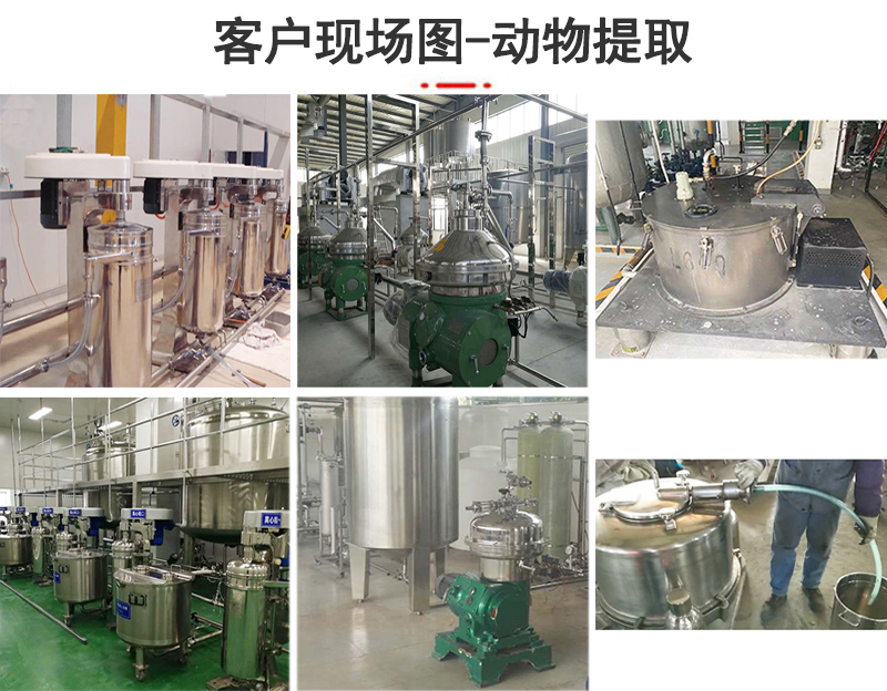 应用设备:根据动物生产工艺的不同,物料的不同参数,可适用的离心机有管式离心机、碟式离心机、平板离心机,其选择依据主要有处理量、含固量、分离效果等因素。