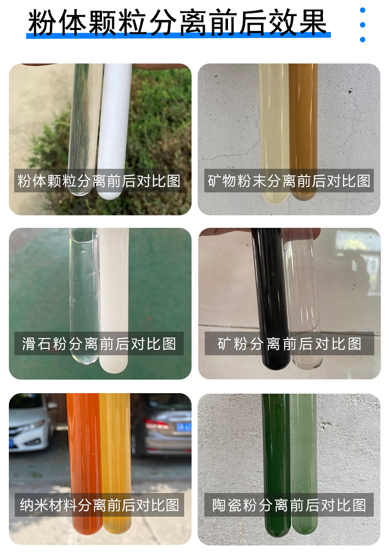 处理过的物料:纳米材料、纳米粉末、粉体颗粒、二氧化铈、高岭土、碳化硅、钨粉、陶瓷粉、陶瓷浆料、钛白粉、油墨、伊利石矿粉、碳粉、铜粉、矿粉、锌粉、金属粉末、铝粉、矿物粉末
