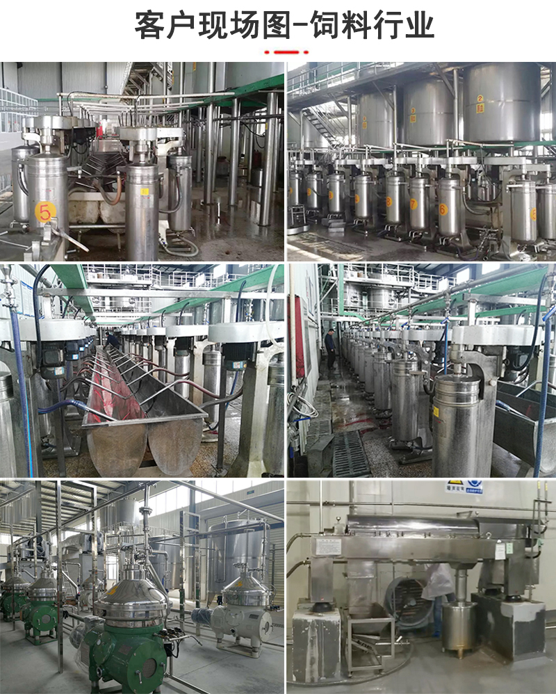 应用设备:根据饲料生产工艺的不同,物料的不同参数,可适用的离心机有管式离心机、碟式离心机、卧螺离心机、平板离心机,其选择依据主要有处理量、含固量、分离效果等因素。