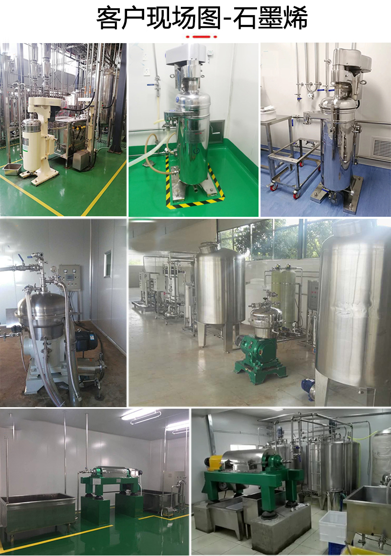 碟式离心机:是一种全自动高转速离心机,适用于大规模氧化石墨烯分散液的澄清(分离石墨残渣)、石墨烯浆料的浓缩(将固含量从0.5%-2%提升至5%-10%)。